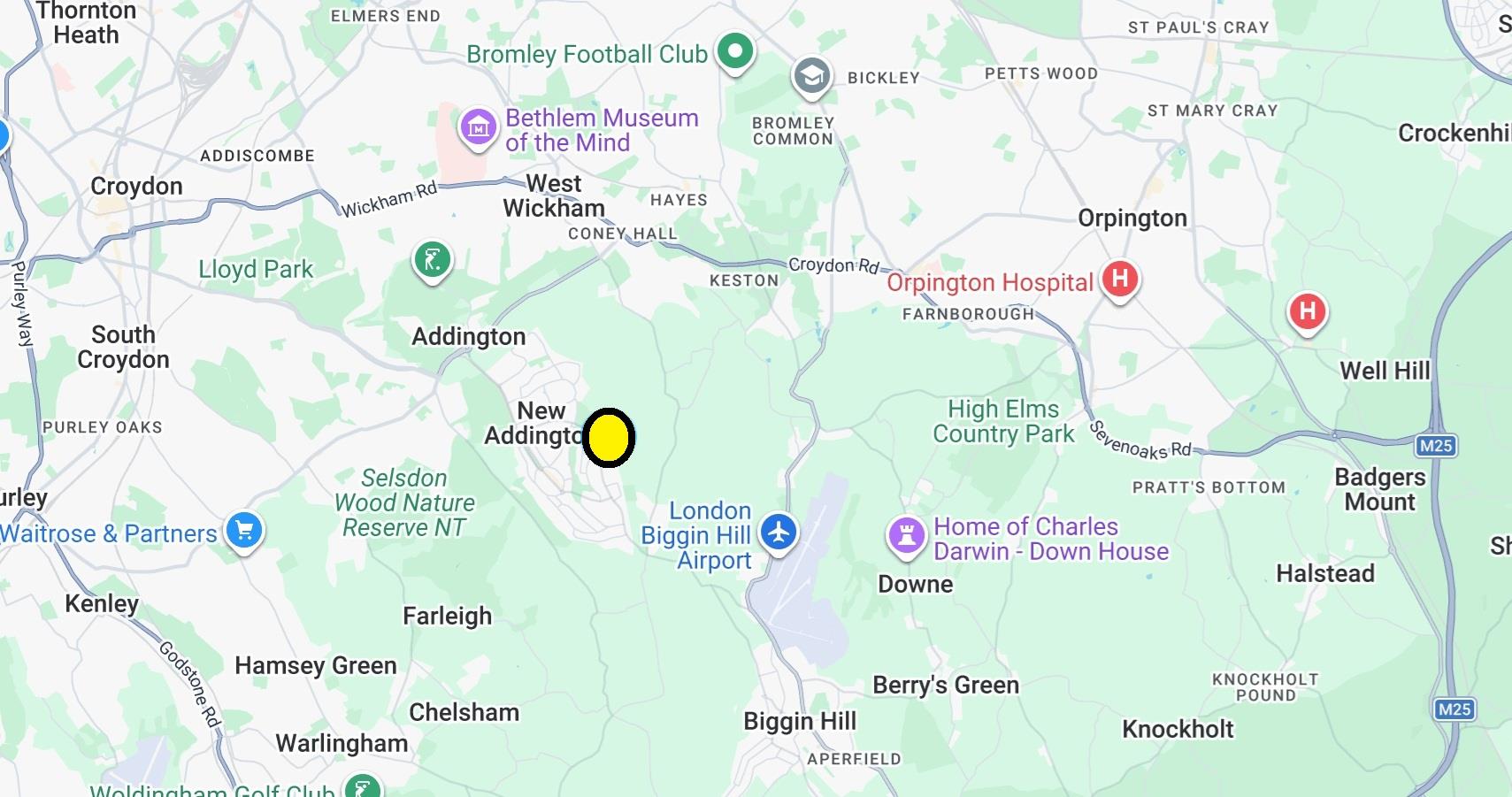 Croydon town centre — approximately 5–6 miles, reachable in 12 minutes by car
