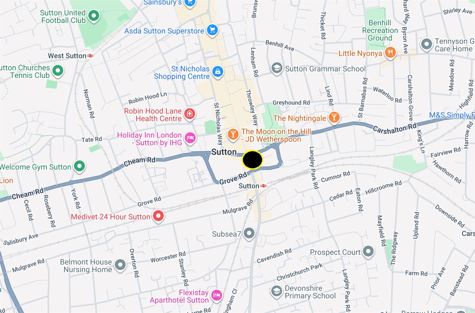 The property occupies a highly prominent corner position on Sutton High Street, directly at the heart of Sutton town centre's primary retail and leisure district. Positioned approximately 50 metres north of Sutton railway station, the building benefits from exceptional footfall and immediate access to one of South London's busiest transport hubs.