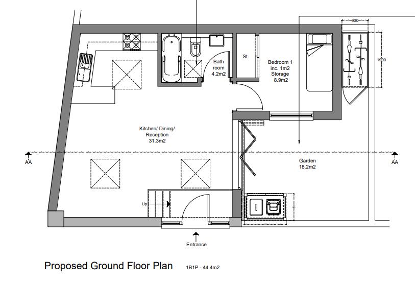 1 Bed single storey building beneath a flat roof with outside space and planning to create a modern 1 bed flat with courtyard