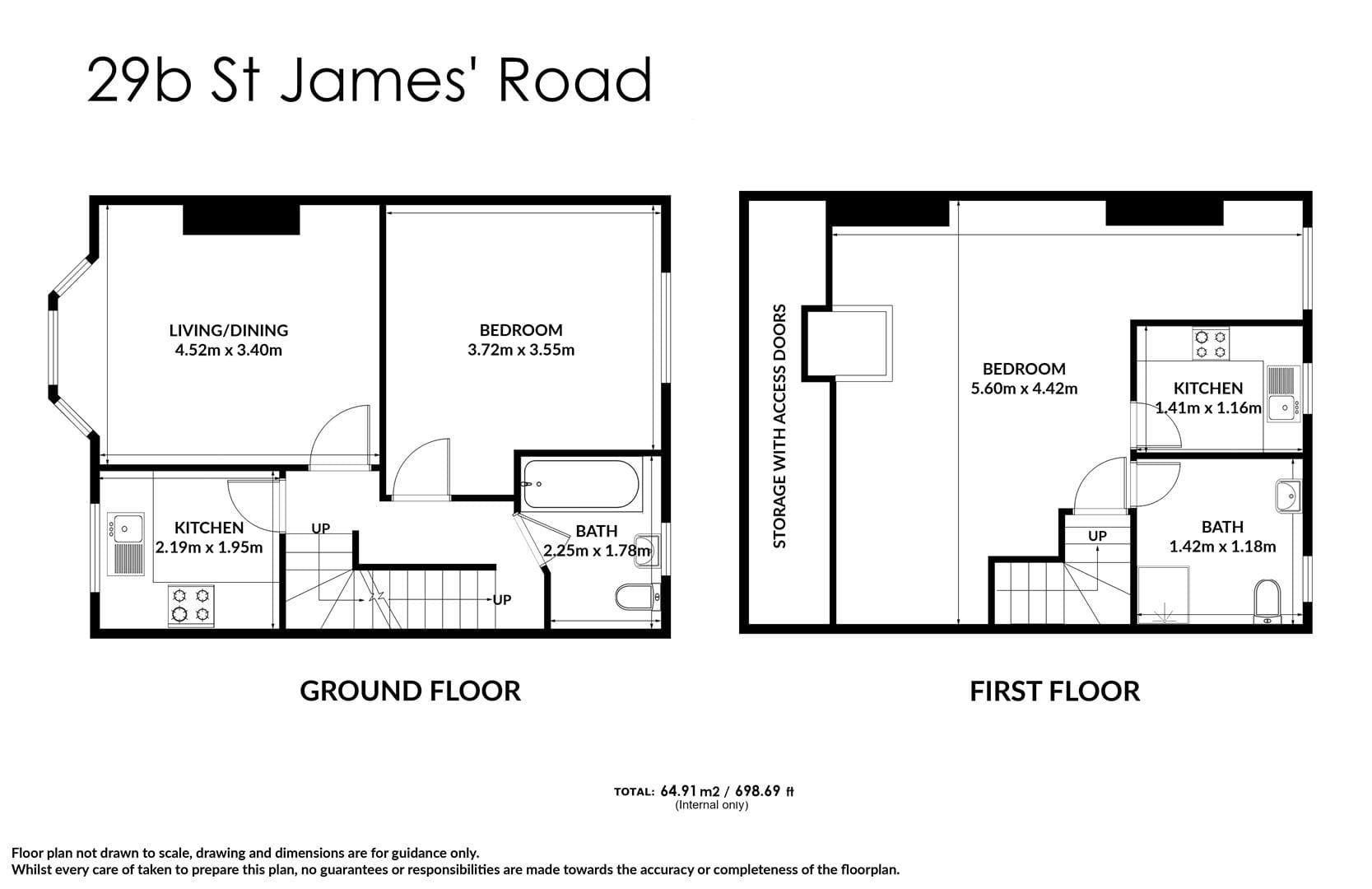 First Floor: Two spacious rooms, a contemporary kitchen, and a stylish bathroom.